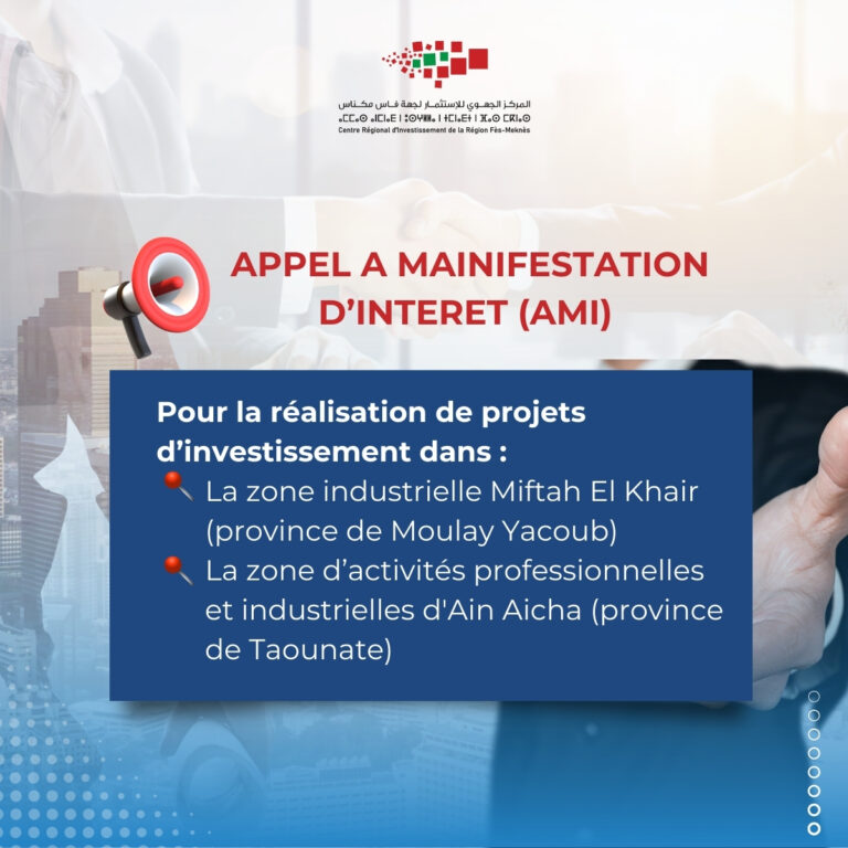 « APPEL A MANIFESTATION D’INTÉRÊT (AMI) POUR LA RÉALISATION DE PROJETS D’INVESTISSEMENT DANS LA ZI MIFTAH EL KHAIR» OU « APPEL A MANIFESTATION D’INTÉRÊT (AMI) POUR LA RÉALISATION DE PROJETS D’INVESTISSEMENT DANS LA ZAPI AIN AICHA » à l’adresse suivante :