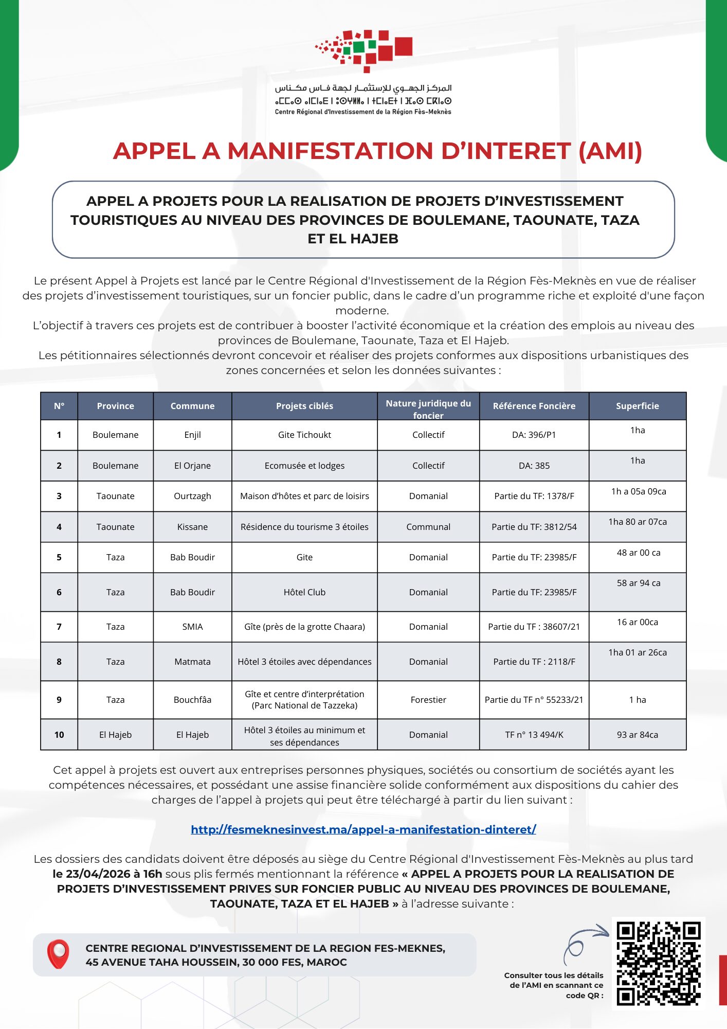 Les dossiers des candidats doivent être déposés au siège du Centre Régional d’Investissement Fès-Meknès au plus tard le 23/04/2026 à 16h sous plis fermés mentionnant la référence «APPEL A PROJETS POUR LA REALISATION DE PROJETS D’INVESTISSEMENT PRIVES SUR FONCIER PUBLIC AU NIVEAU DES PROVINCES DE BOULEMANE, TAOUNATE, TAZA ET EL HAJEB» à l’adresse suivante :