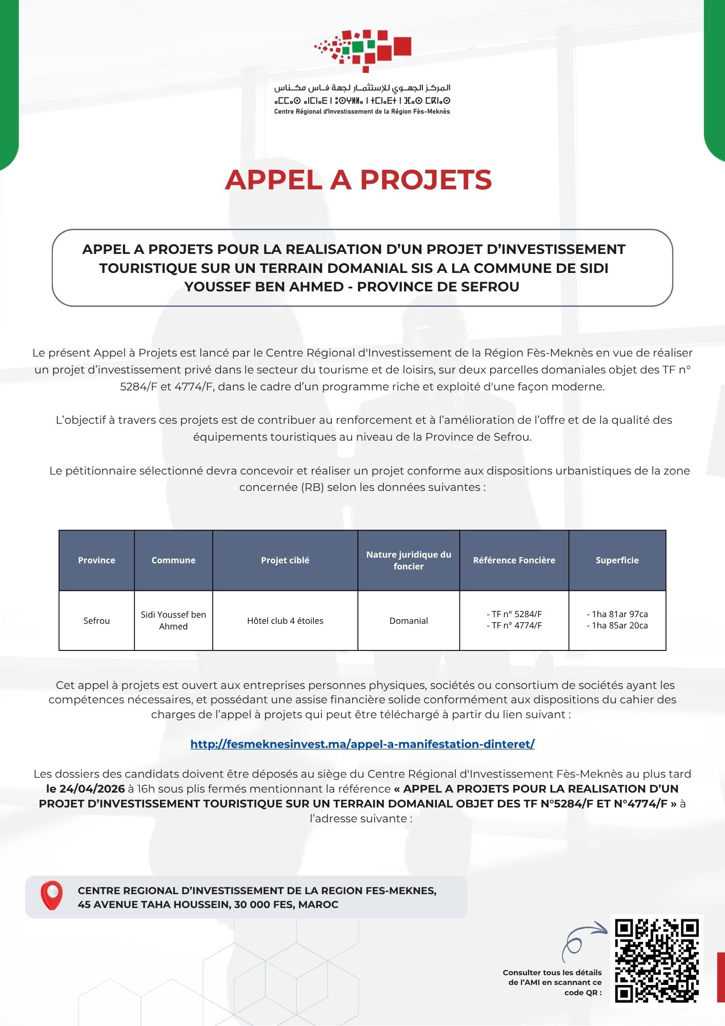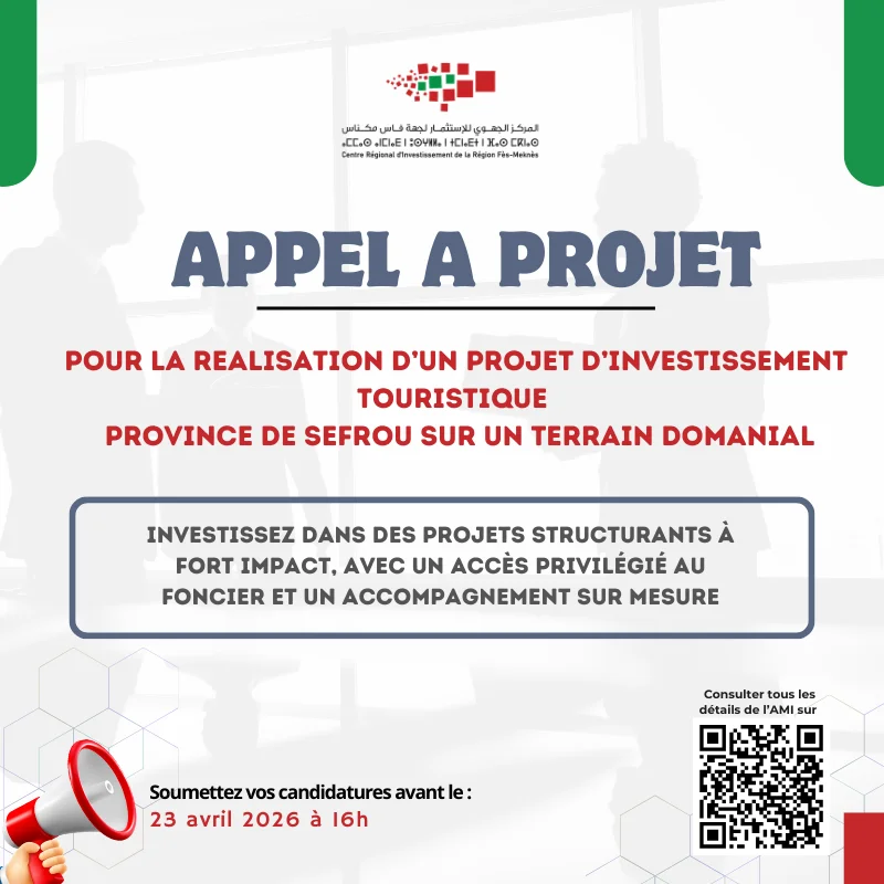 Les dossiers des candidats doivent être déposés au siège du Centre Régional d’Investissement Fès-Meknès au plus tard le 23/04/2026 à 16h sous plis fermés mentionnant la référence «APPEL A PROJETS POUR LA REALISATION D’UN PROJET D’INVESTISSEMENT TOURISTIQUE SUR UN TERRAIN DOMANIAL A SEFROU » à l’adresse suivante :