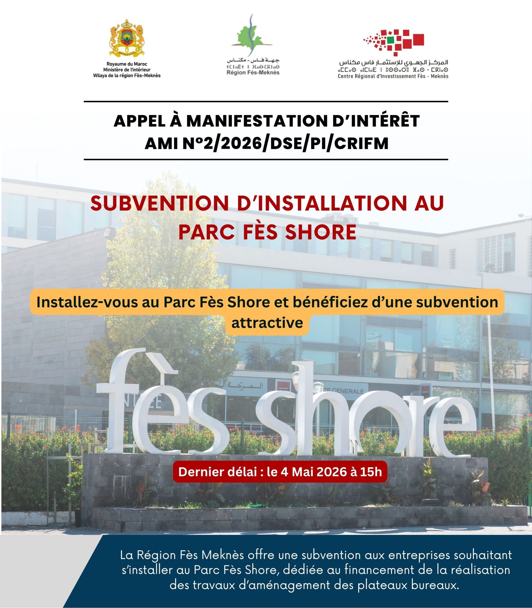 APPEL À MANIFESTATION D’INTÉRÊT N° 02/2026/DSE/PI/CRIFM ATTRIBUTION DE LA SUBVENTION D’INSTALLATION AU PARC FÈS-SHORE