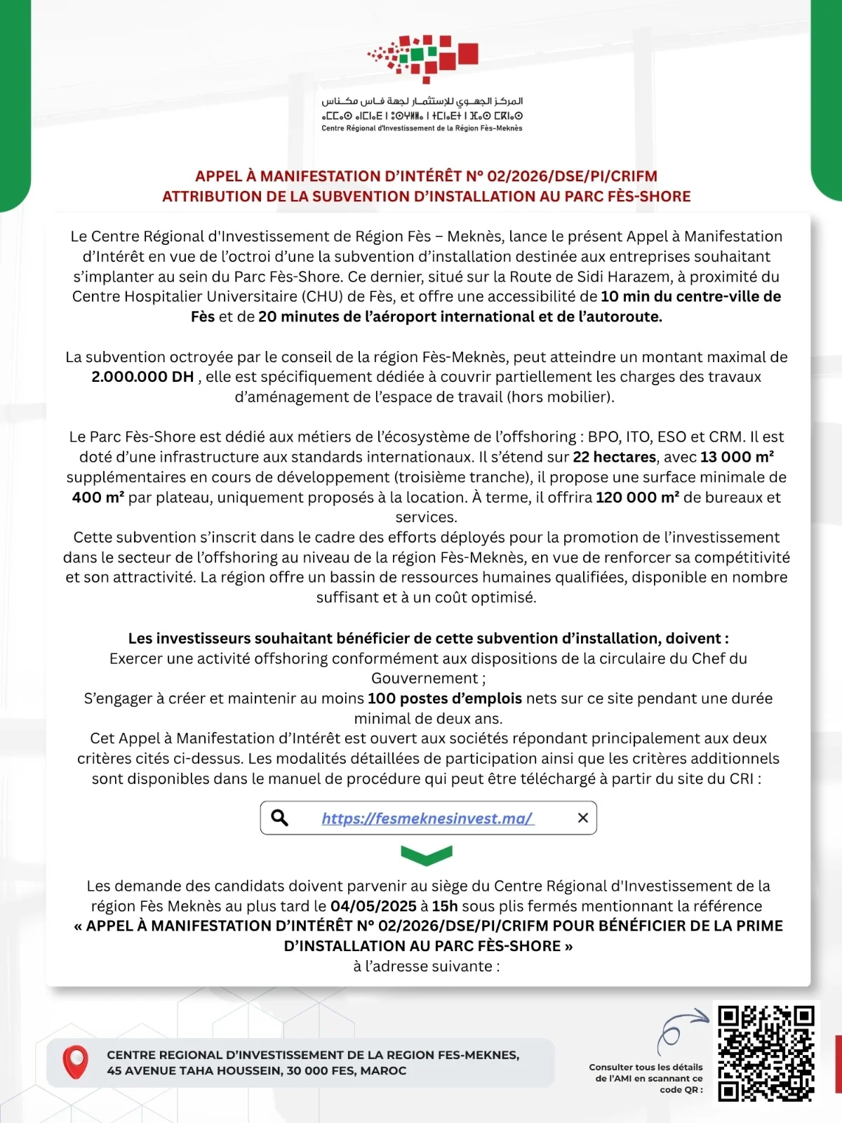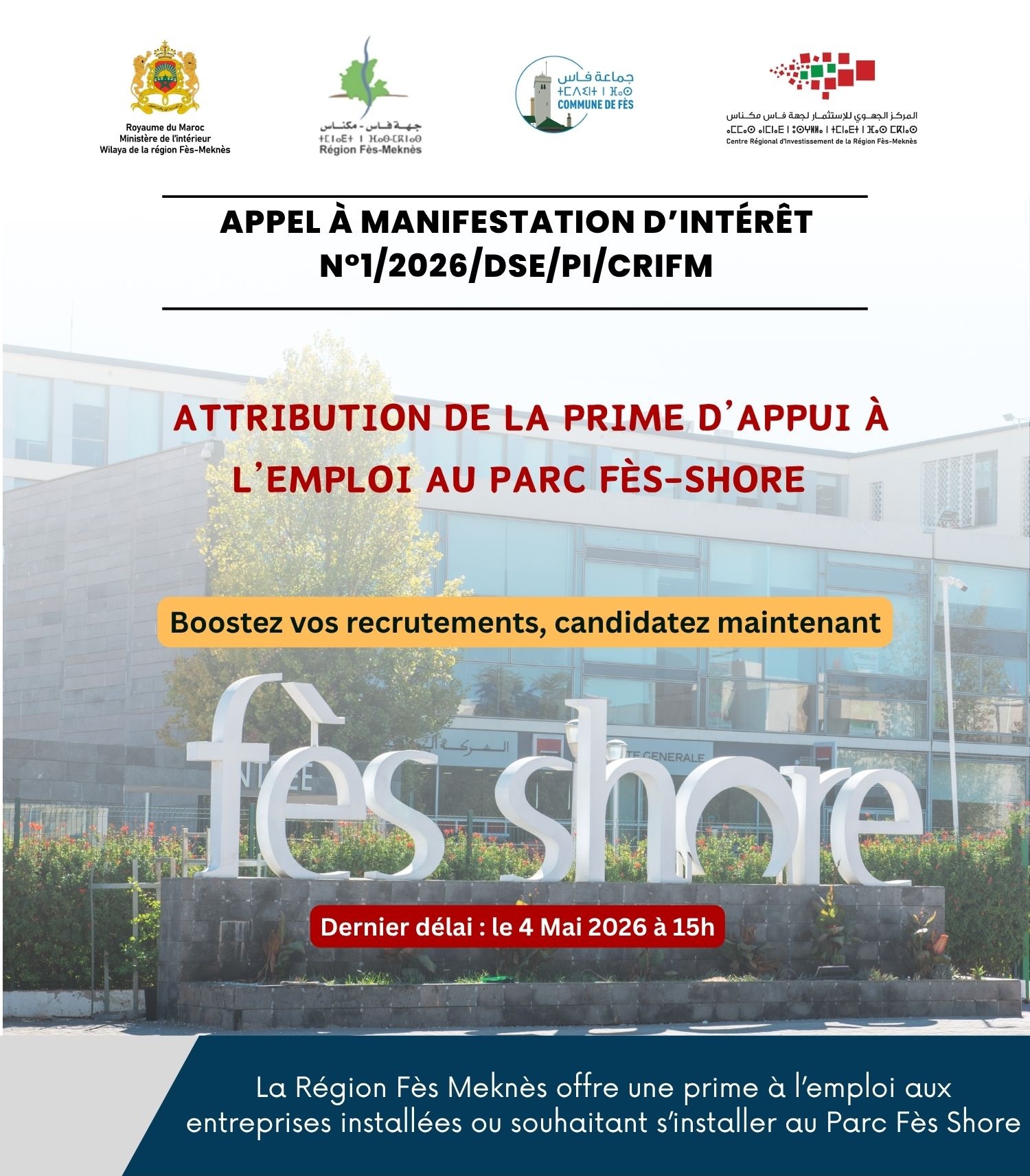 Le CRI Fès-Meknès, en partenariat avec la Wilaya de la Région Fès-Meknès, le Conseil Régional Fès-Meknès, et le Conseil Communal de la ville de Fès, a le plaisir de lancer l’Appel à Manifestation d’Intérêt N°02/2025/DAI/CRIFM pour sélectionner les sociétés éligibles à la prime d’appui à l’emploi au Parc Fès Shore destinée aux entreprises implantées ou souhaitant s’implanter au niveau de ce Parc.