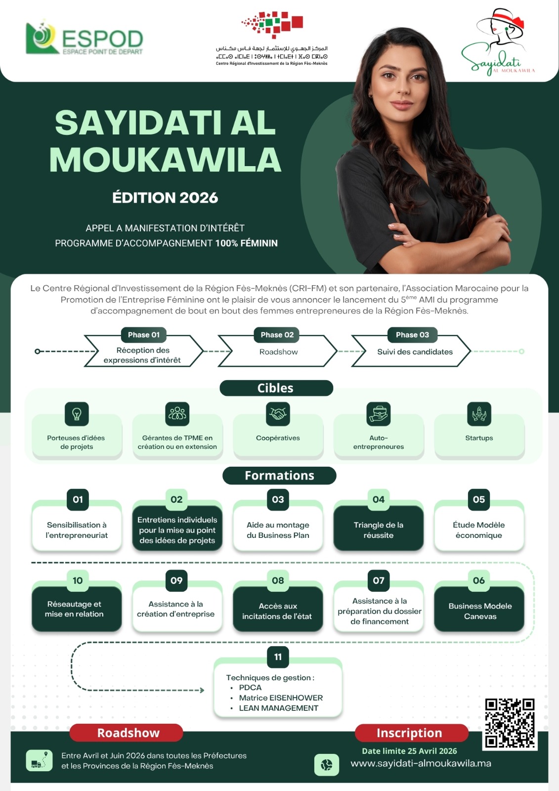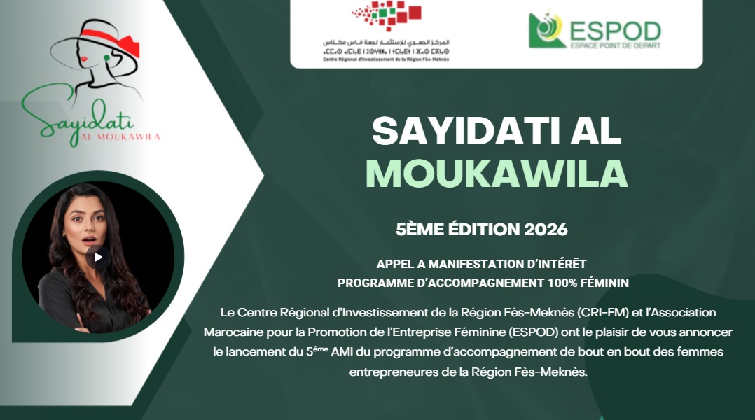 Le Centre Régional d’Investissement de la Région Fès-Meknès (CRI-FM) et l’Association Marocaine pour la Promotion de l’Entreprise Féminine (ESPOD) ont le plaisir de vous annoncer le lancement du 5ème AMI du programme d’accompagnement de bout en bout des femmes entrepreneures de la Région Fès-Meknès.