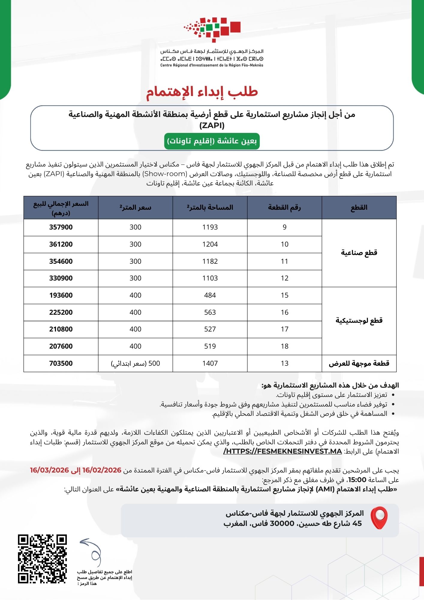يعلن المركز الجهوي للاستثمار لجهة فاس–مكناس عن إطلاق طلب إبداء الاهتمام من أجل اختيار مستثمرين لإنجاز مشاريع استثمارية على قطع أرضية مخصصة للصناعة واللوجستيك وصالة للعرض (Show-room) بمنطقة الأنشطة المهنية والصناعية (ZAPI) بعين عائشة، التابعة لجماعة عين عائشة بإقليم تاونات.